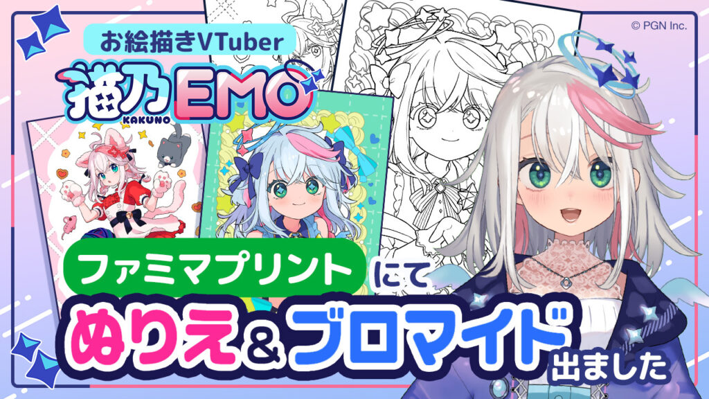 当社所属VTuber 描乃EMO(かくのえも)のイラストが、 この度コンビニプリントサービス「ファミマプリント」にて販売開始となりました。 今回のラインナップは、ぬりえ作品と同柄のブロマイドの新作です。ぬりえには、PNG…
